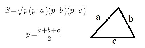Площадь S треугольника со сторонами a, b, c выражается формулой: